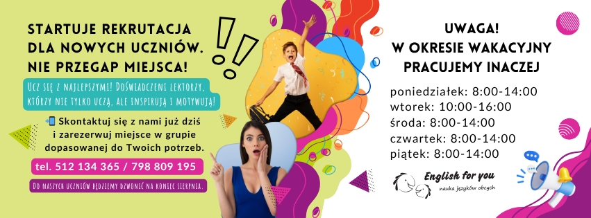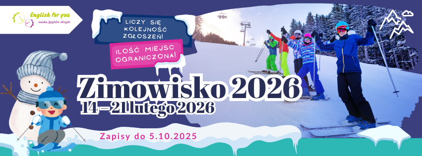 - Zimowisko 2026Zima, która zostanie w pamięci! Czy pamiętasz, jak ekscytujące były ferie zimowe w dzieciństwie? Śnieg, narty, sanki i beztroska zabawa z przyjaciółmi! A teraz wyobraź sobie, że możesz podarować swojemu dziecku podobne wspomnienia, ale w zupełnie nowej, niezapomnianej odsłonie. W English for you wierzymy, że nauka idzie w parze z przygodą. Dlatego z radością zapraszamy… Dowiedz się więcej: Zimowisko 2026
